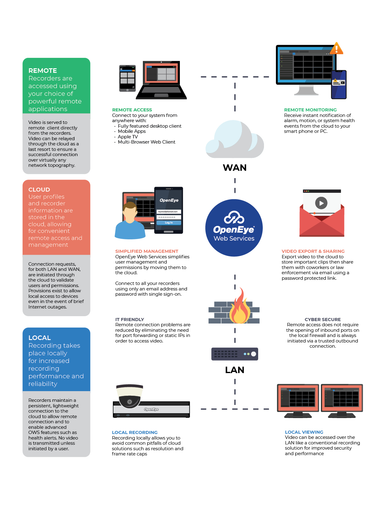 OpenEye Web Services is a scalable and secure video surveillance solution that simplifies operations and management by moving these functions to the cloud. Combining the performance and reliability of local recording with the convenience and flexibility of the cloud, OWS produces a greater return on your investment, saves you time, and provides an easier, more secure surveillance solution.