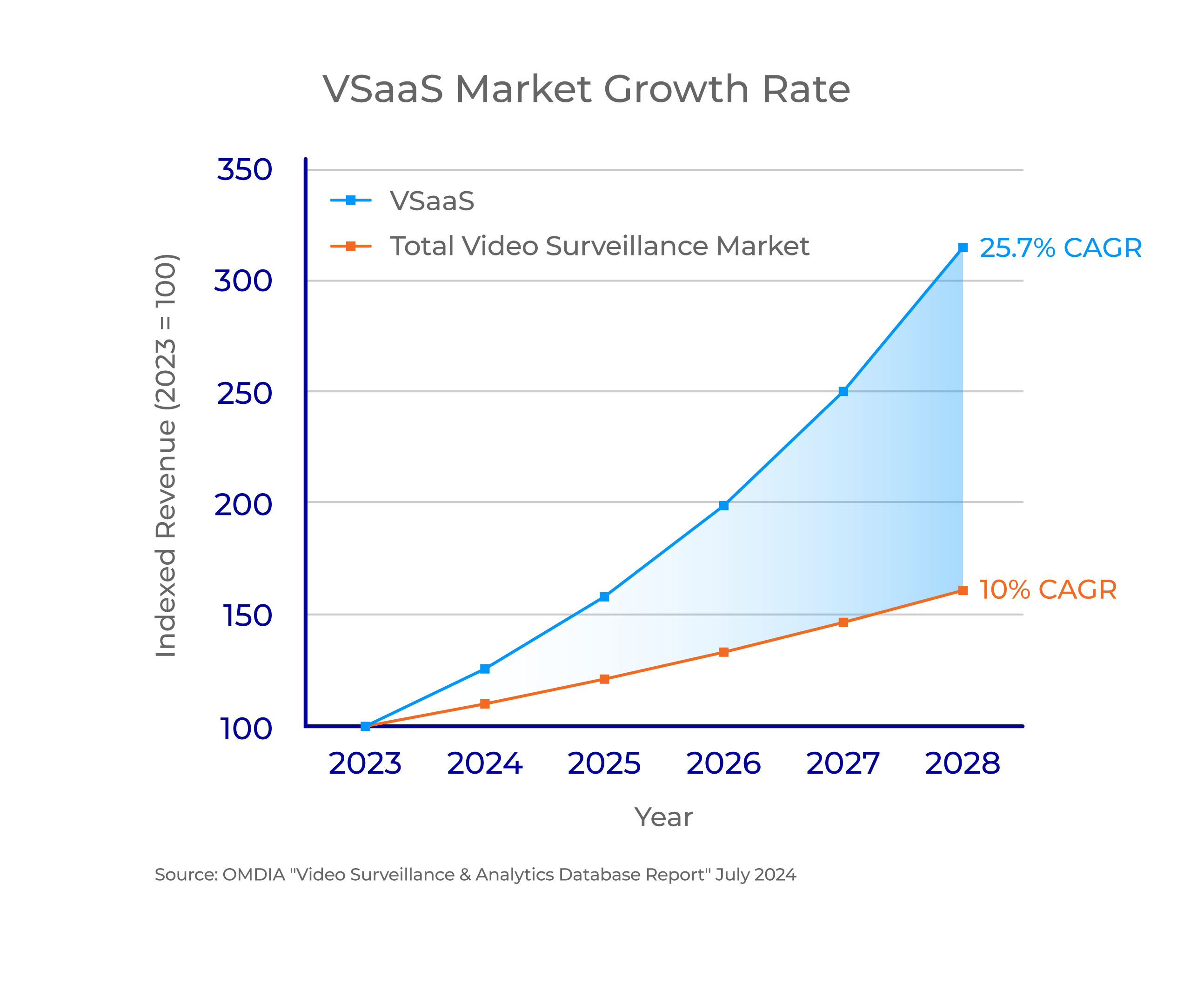 Video surveillance as a service (VSaaS) is revolutionizing the way video security is offered to businesses everywhere. By choosing an advanced VSaaS solution, you’ll be able to provide a more complete system that benefits both you and your customers. The US market for VSaaS is projected to grow at a compounded annual rate of 25.7 percent through 2028, significantly outpacing the total video surveillance market, which is expected to grow at a rate of only 10 percent annually.